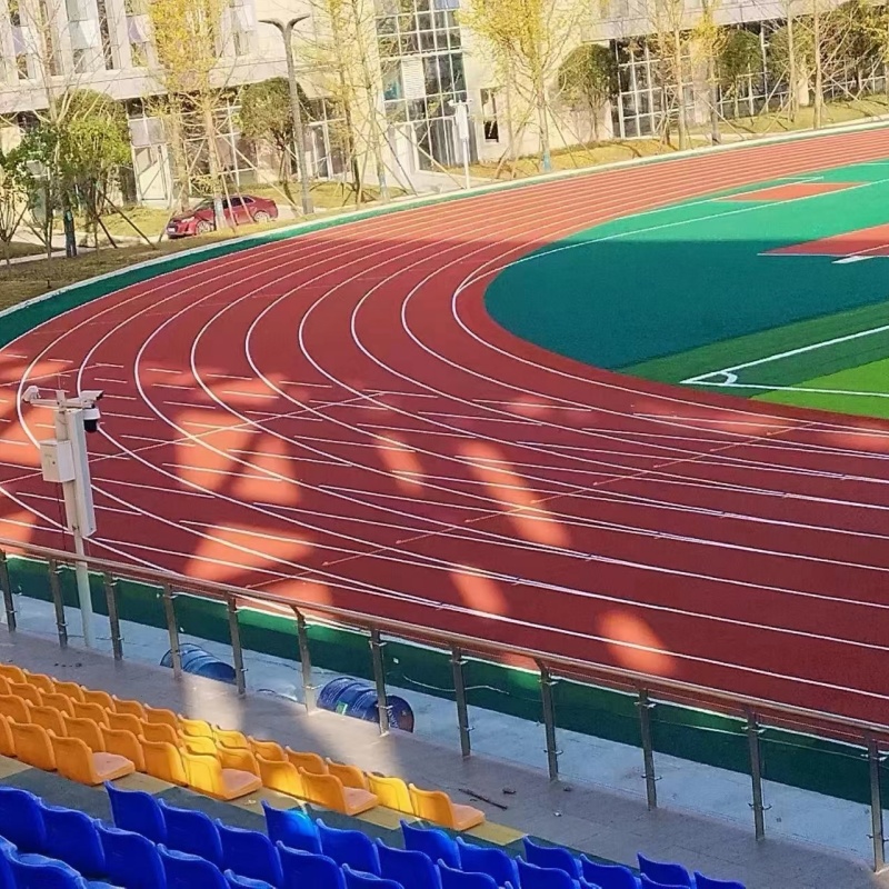 抗钉力强:即使在受力大,使用频繁的百米起跑点,表面亦不会受钉鞋和起跑架损坏。耐侯性强:胶粒表面,抵抗紫外线,臭氧,风雨,延长使用寿命。越的耐磨防滑性能采用更为耐磨的聚氨酯面层配方,取代epdm颗粒作为防滑面层,配方添加特种助剂及金刚沙粉进行喷涂,使面层形成一种更为防滑耐磨的凹凸面,既保留了聚氨酯跑道材料耐侯,耐老化等传统特点,又克服了传统聚酯跑道易脱粒的病.。